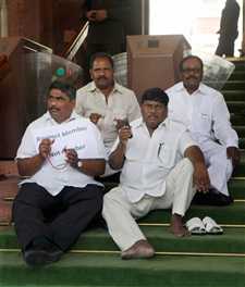 नई दिल्ली। प्रथक तेलंगाना राज्य के मामले को लेकर सदन में विरोध करने पर तेलुगु देसम पार्टी के निलंबित सांसदों ने बुधवार को संसद के गेट पर बैठकर झाल मंजीरा बजाकर अपना विरोध जताया। उनका यह अंदाज कई लोगों के ध्यान आकर्षण का केंद्र रहा। टीडीपी सांसद समेत कांग्रेस के भी सांसद भी अलग राज्य का विरोध कर रहे हैं।